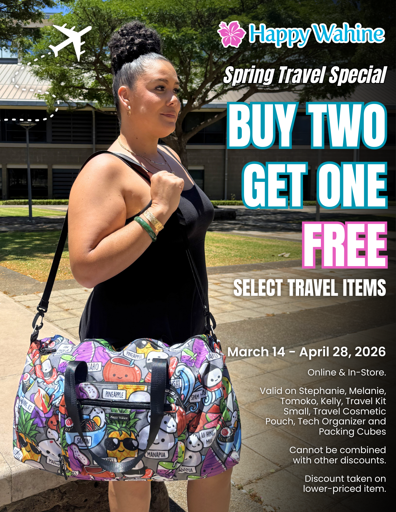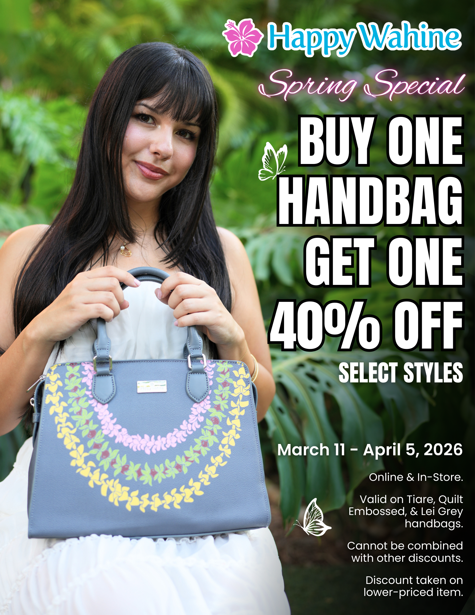 Happy Wahine is a local Hawaiian brand est. 2012 with the mission to share the Aloha lifestyle through everyday useful and practical accessories. Unique designs and unique products on our handbags, wallets, and accessories turn every woman into a Happy Wahine and Aloha Ambassador!