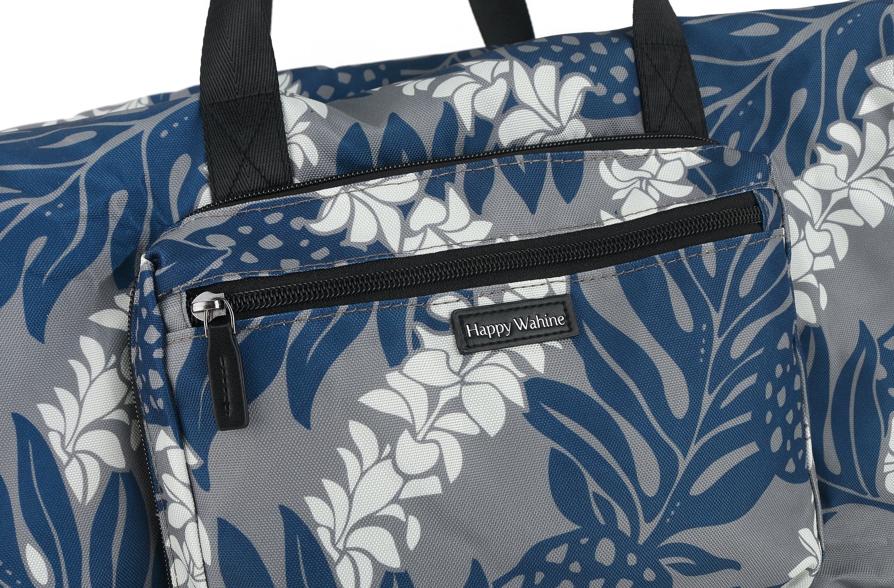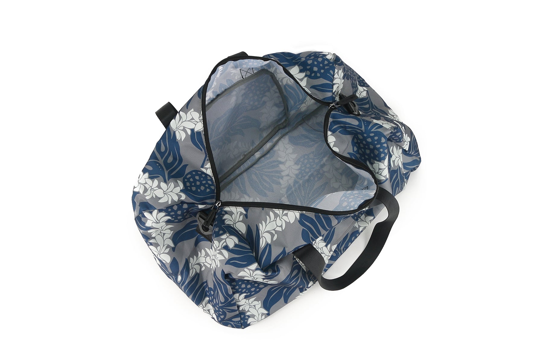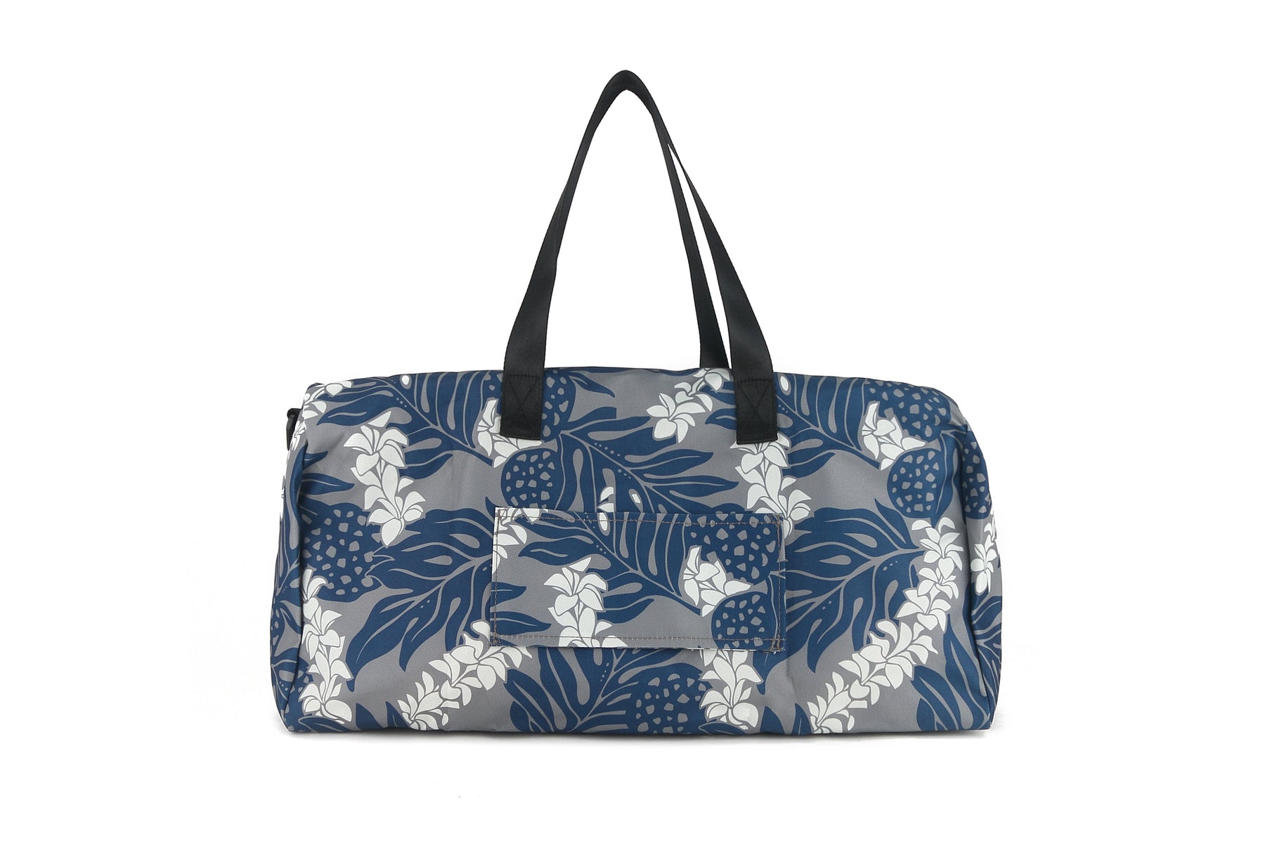 Get ready to travel with our exclusive Stephanie Ulu Lei Grey duffle bag. This duffle features a zippered top with an outside zippered pocket, nylon straps and a roomy interior. It can also be slipped over a luggage handle for easy travel and the duffel folds into itself for easy storage.