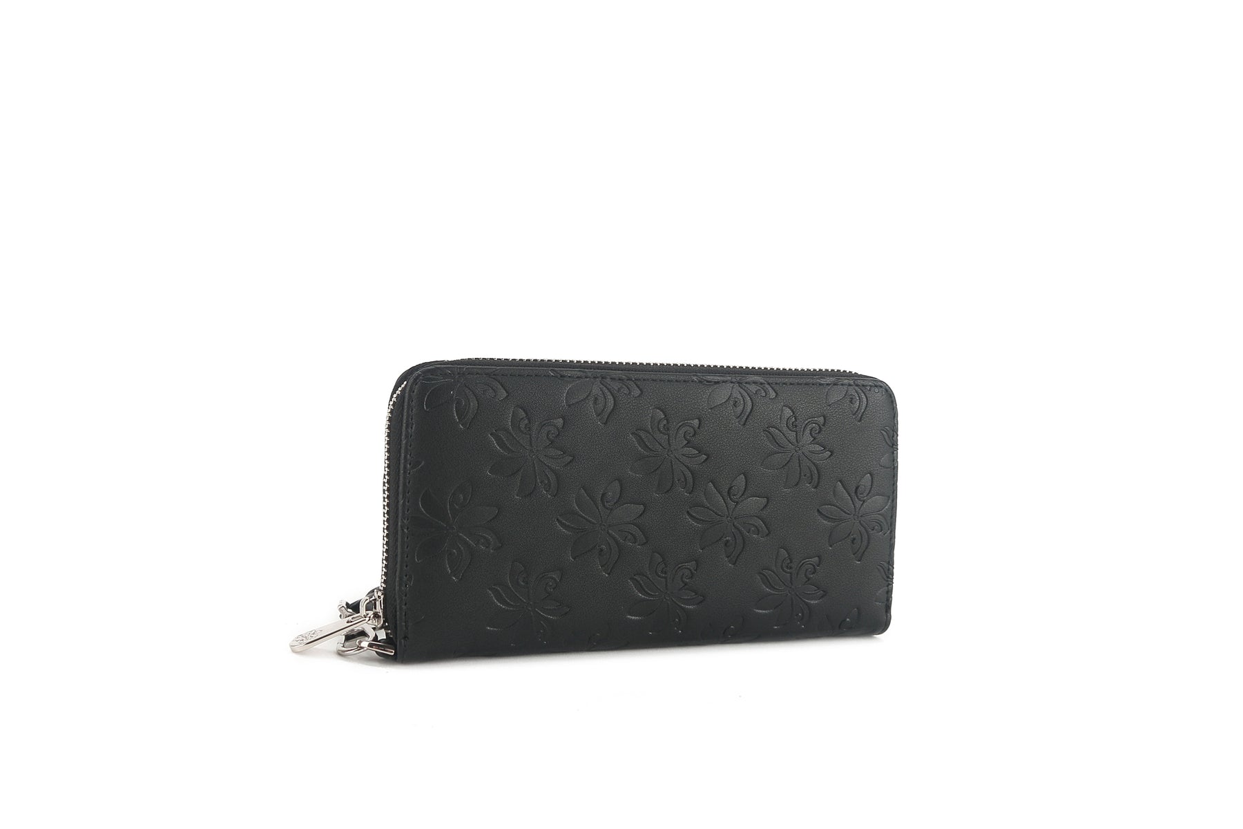 Hold all your essentials in the palm of your hand with the Kaylee Wallet! The wallet has a detachable wristlet strap, 8 credit card slots, 2 side pockets for paper money, 1 zippered coin divider, and 3 separated inside compartments. This wallet is also large enough to hold a passport and phone, and it is RFID protected to keep your cards safe! Our exclusive Tiare Embossed print in black is the perfect compliment to your purse or outfit!