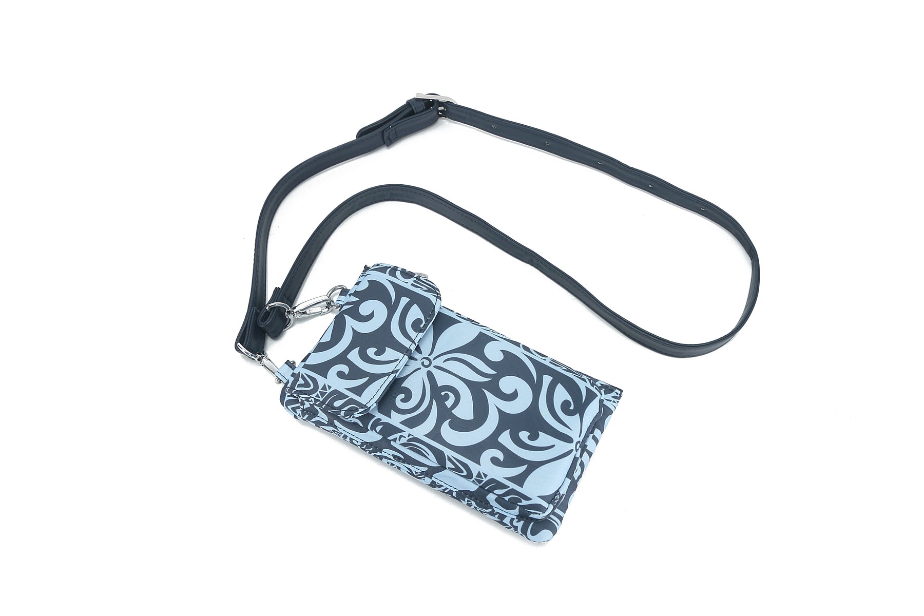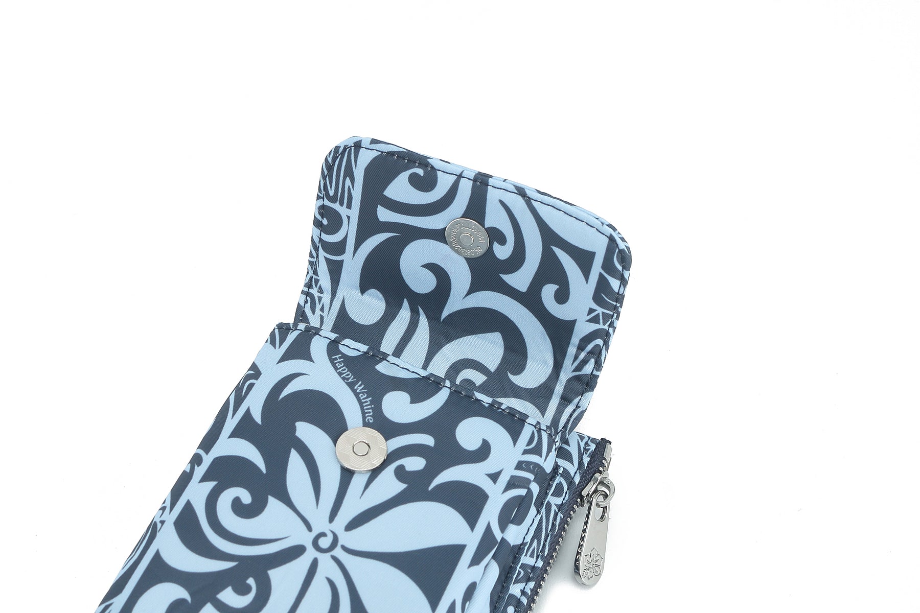 Looking to carry all of your most important belongings all in one? This crossbody phone wallet is perfect for those quick store runs or errands that need to be done. The Crossbody Phone Wallet Anna Keʻolu Tapa Tiare Teal features an outside button up pocket to carry any universal cell phone. The zipper pocket reveals 3 inside card pockets; leaving just enough room to fit all of your on the go items.