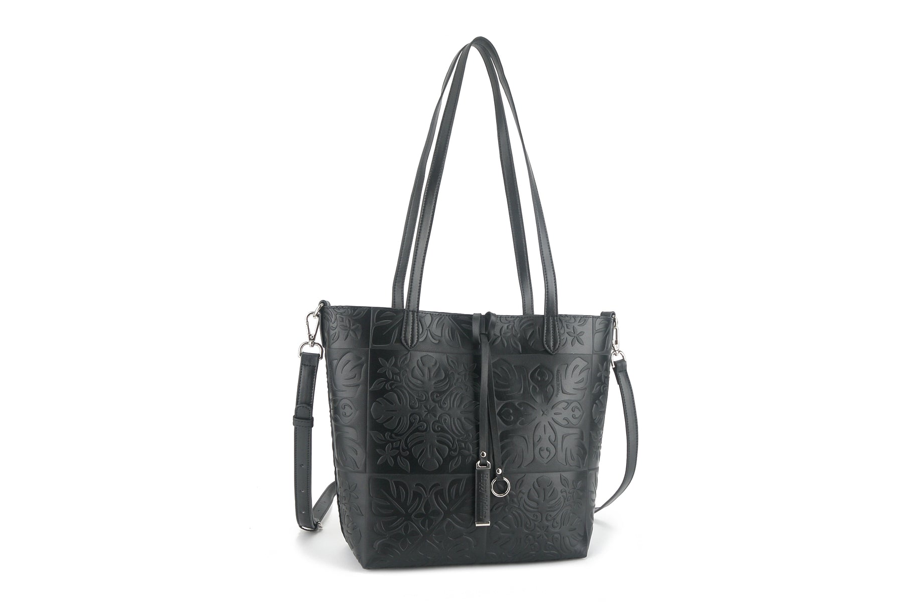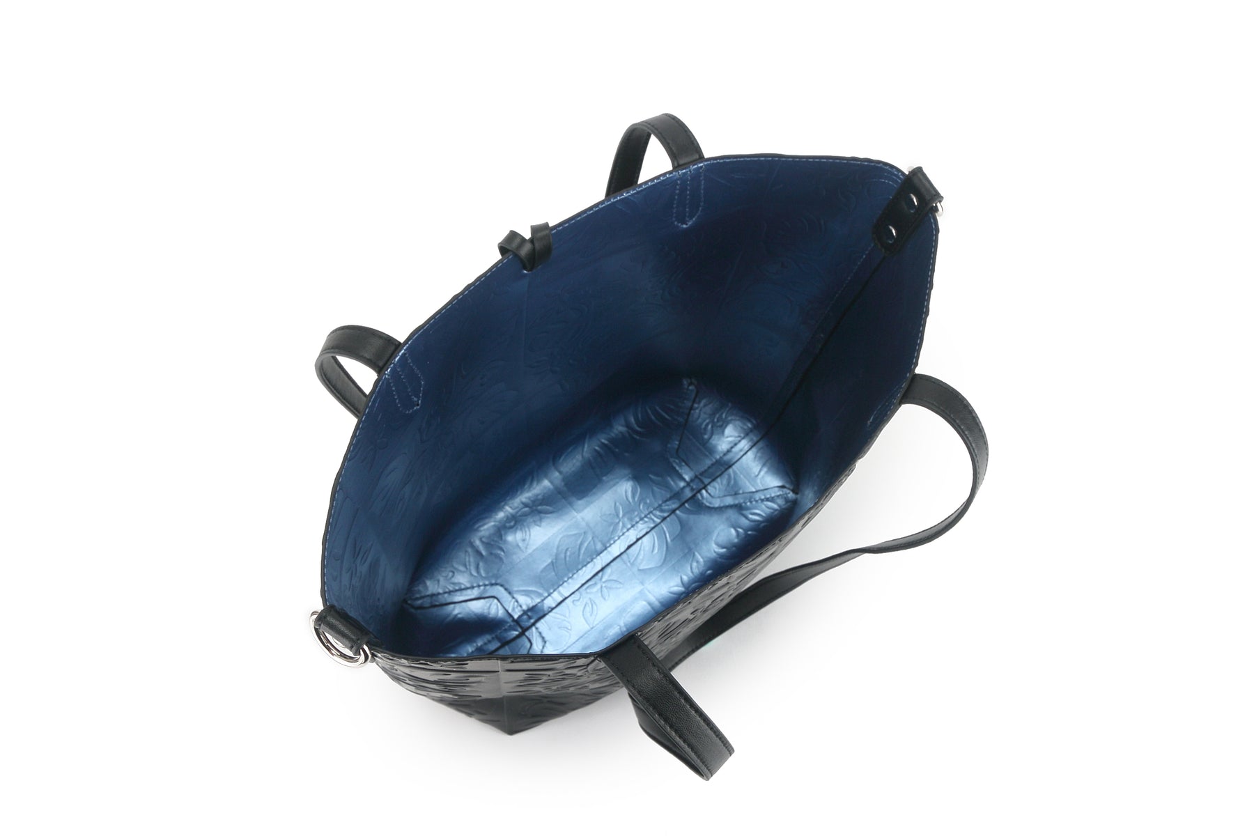 The perfect everyday bag is the Nancy! This tote bag is reversible with a solid color on the inside and our stunning Quilt Black Embossed design on the outside. Included in this handbag is another bag! This inside pouch comes with a longer strap and can be used separately as a cross-body purse, or leave it in the bigger bag to help organize and protect all your belongings with the full zip feature. This is the perfect lightweight, flexible, great everyday reversible tote. The high-quality vegan leather material allows easy maintenance for this clutch and provides a great leather like look-and-feel without the weight.
