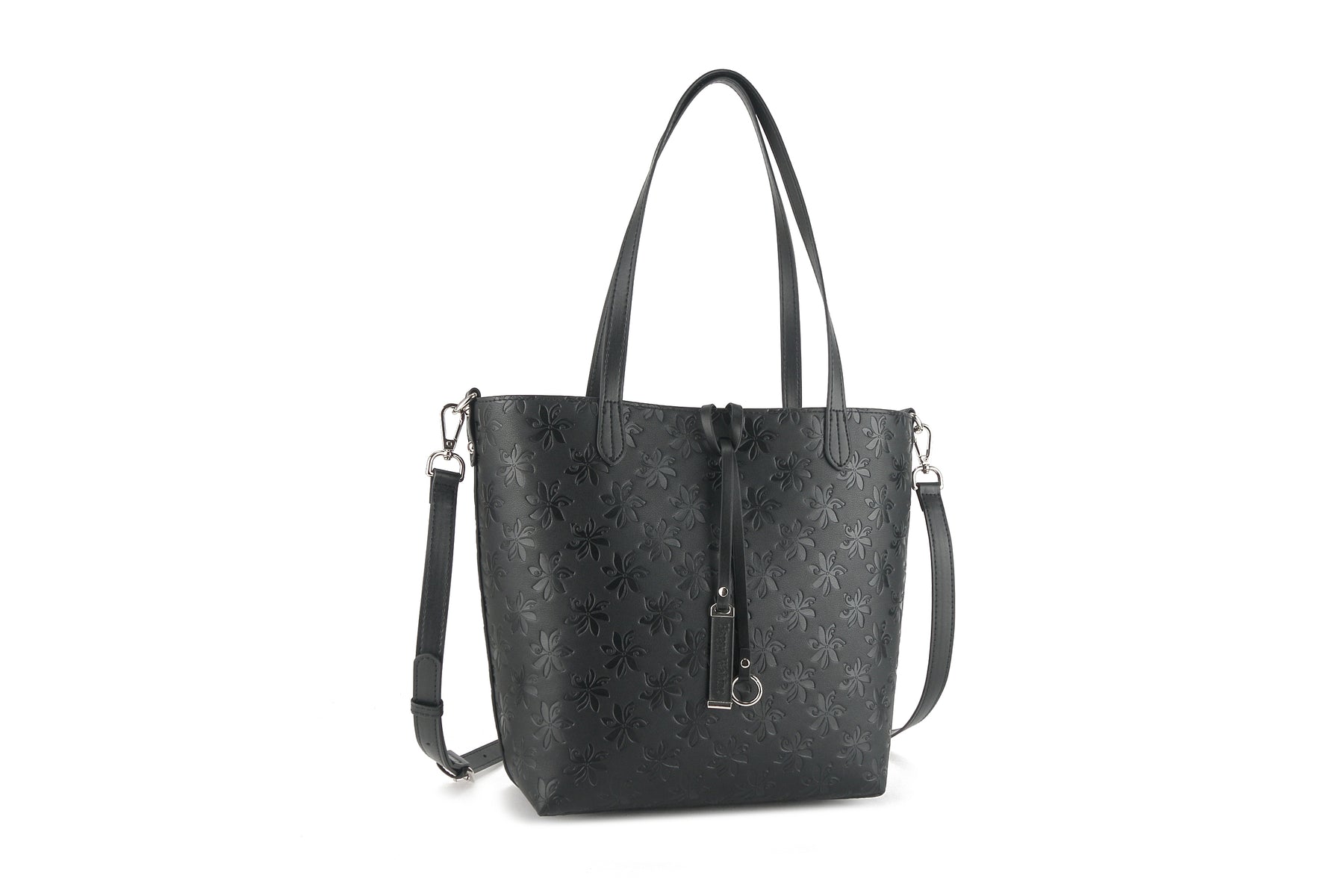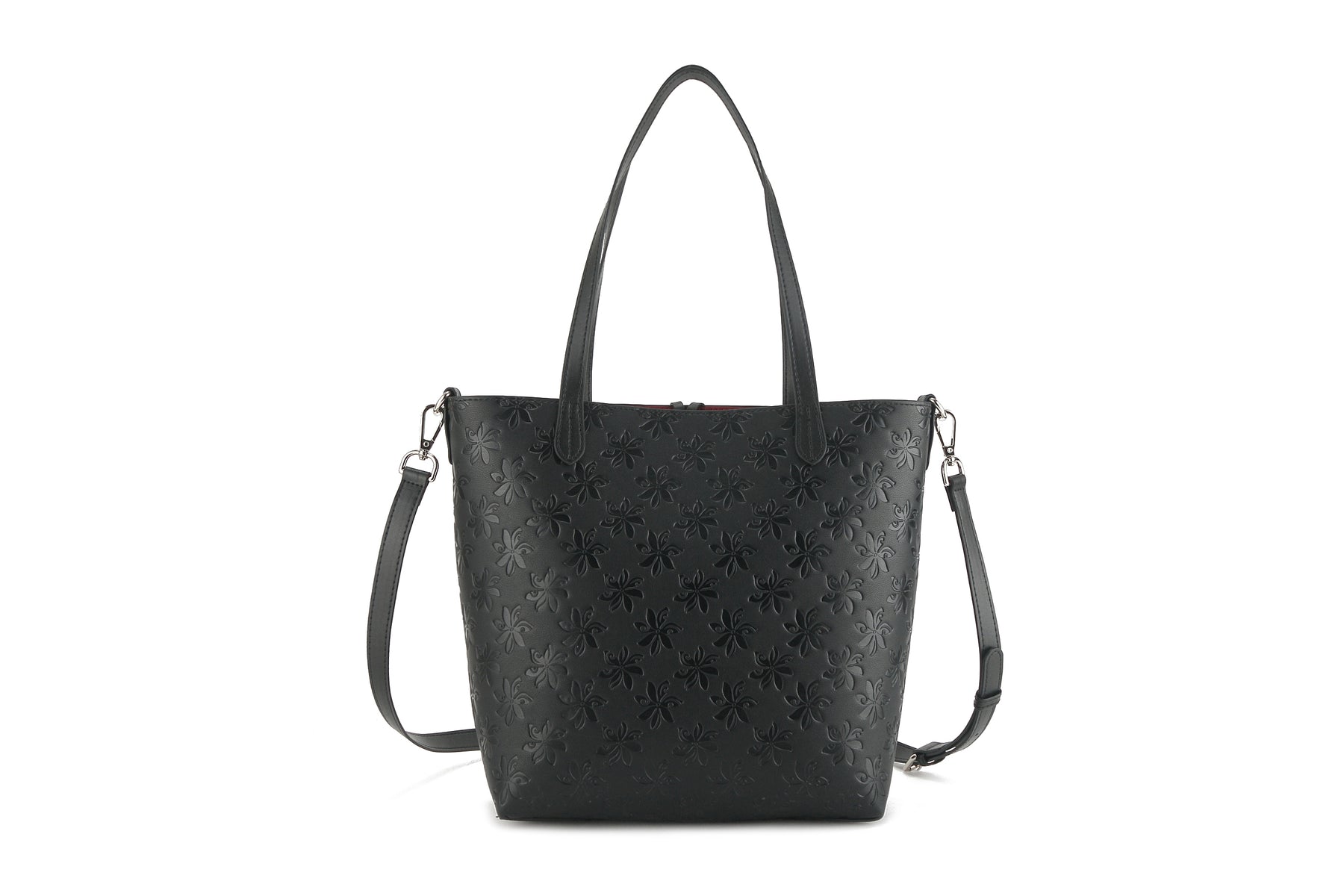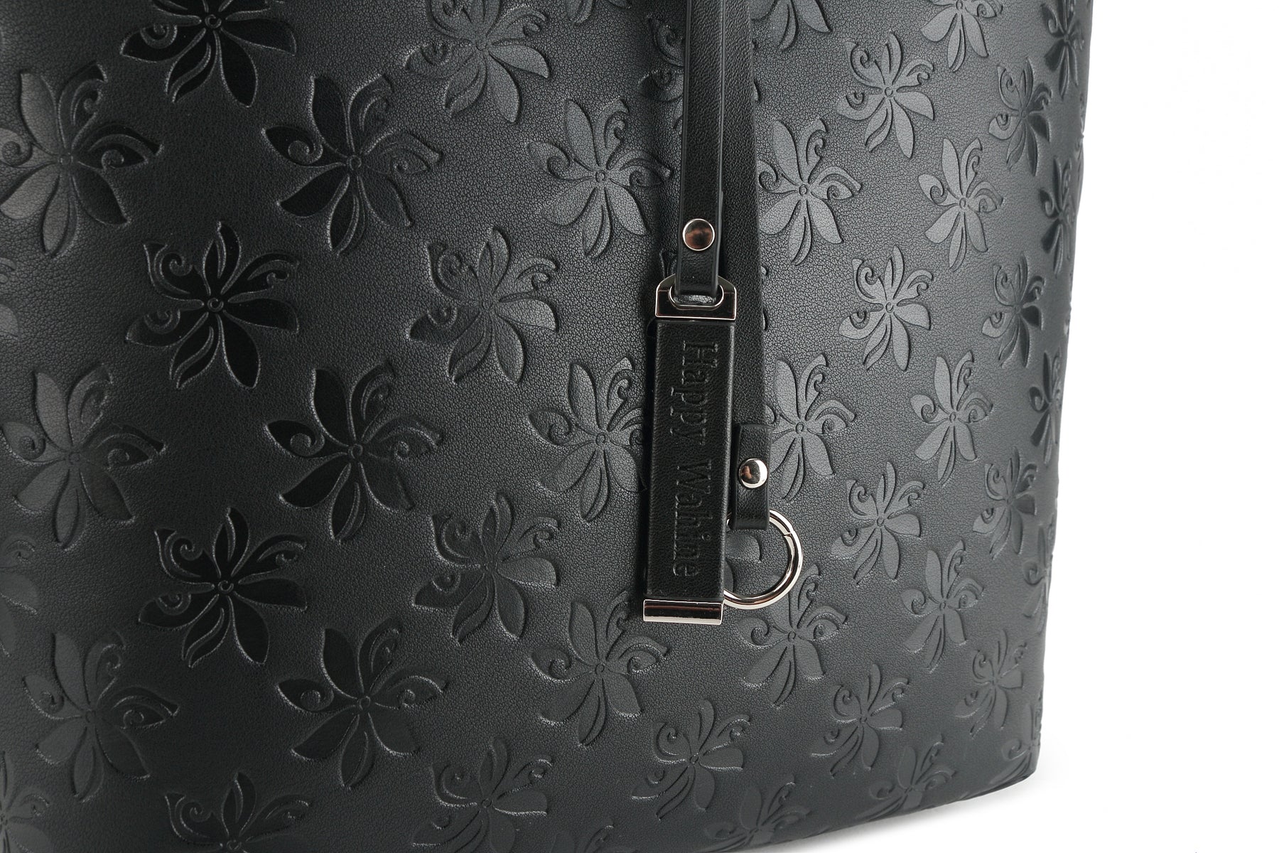 The perfect everyday bag is the Nancy! This tote bag is reversible with a solid color on the inside and our stunning Tiare Embossed Black print on the outside. Included in this handbag is another bag! This inside pouch comes with a longer strap and can be used separately as a cross-body purse, or leave it in the bigger bag to help organize and protect all your belongings with the full zip feature. This is the perfect lightweight, flexible, great everyday reversible tote. The high-quality vegan leather material allows easy maintenance for this clutch and provides a great leather like look-and-feel without the weight.