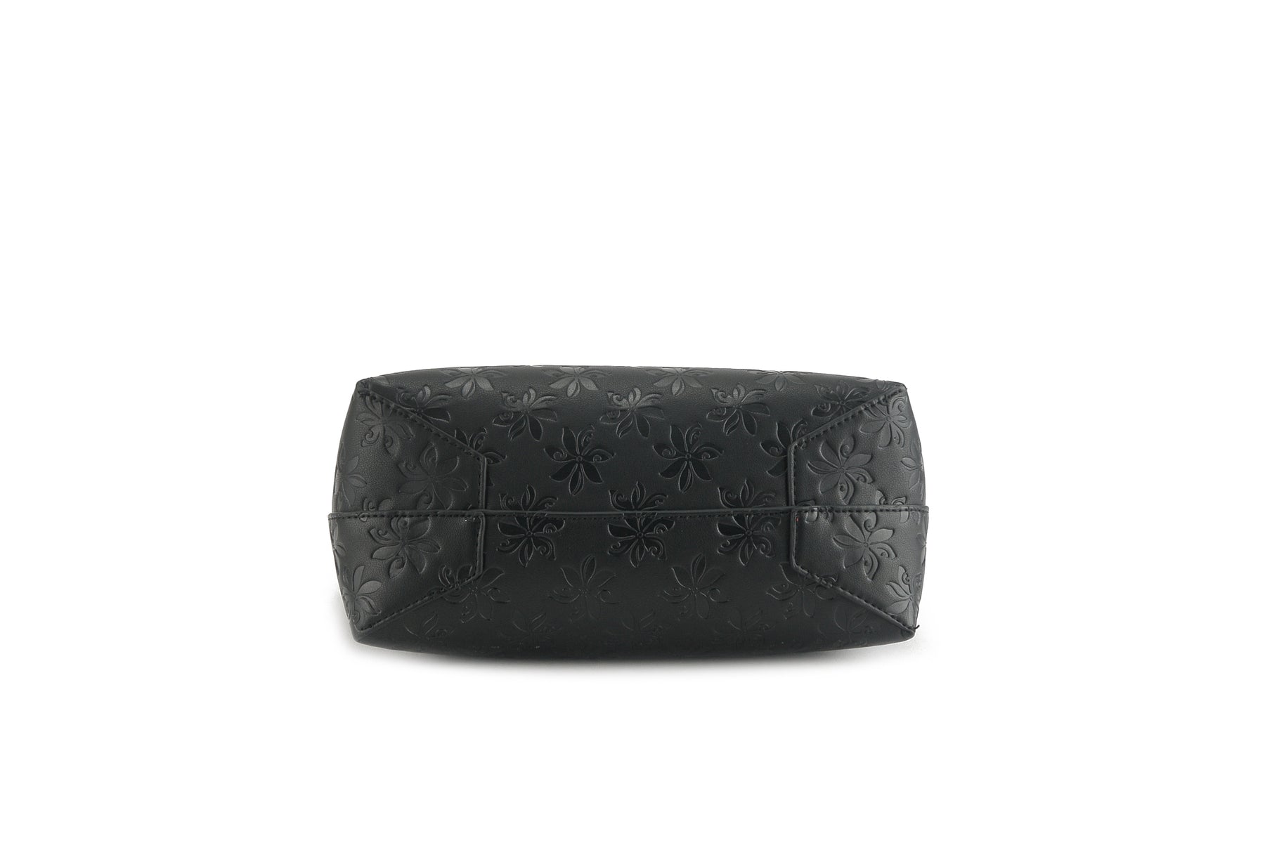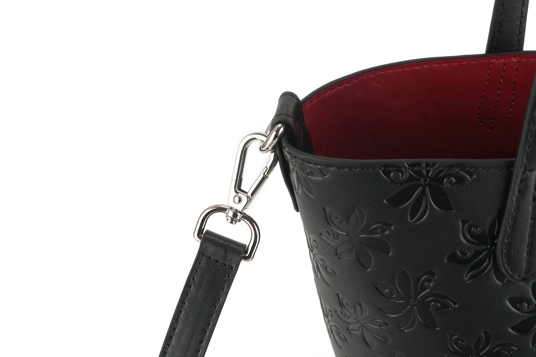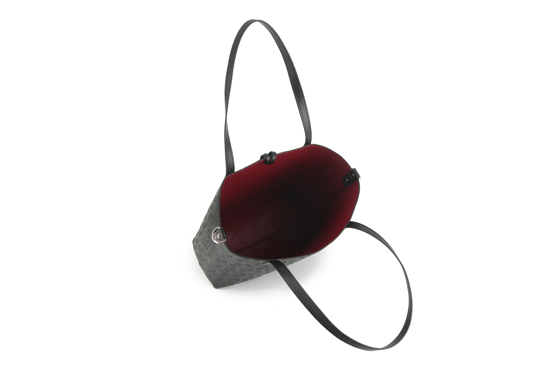 The perfect everyday bag is the Nancy! This tote bag is reversible with a solid color on the inside and our stunning Tiare Embossed Black print on the outside. Included in this handbag is another bag! This inside pouch comes with a longer strap and can be used separately as a cross-body purse, or leave it in the bigger bag to help organize and protect all your belongings with the full zip feature. This is the perfect lightweight, flexible, great everyday reversible tote. The high-quality vegan leather material allows easy maintenance for this clutch and provides a great leather like look-and-feel without the weight.