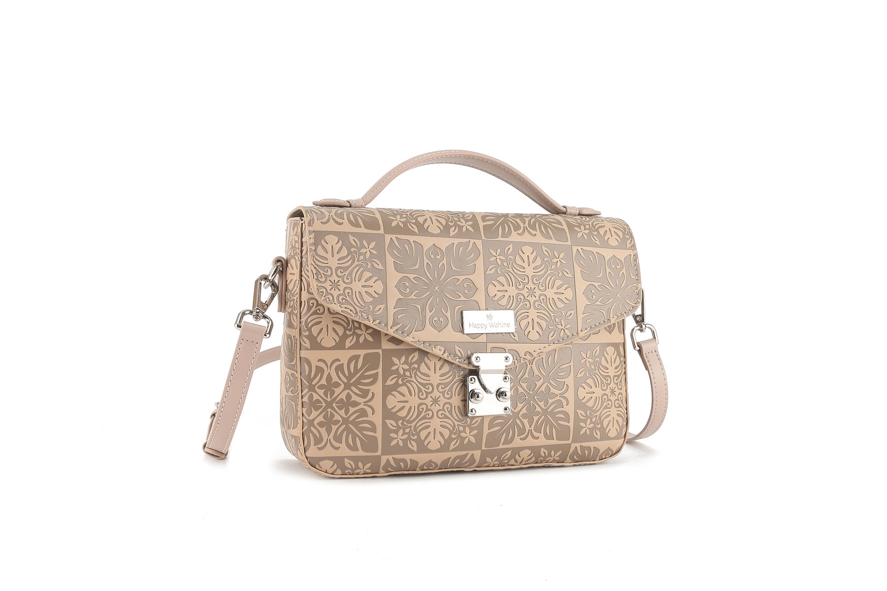 Saw this handbag on the website and ordered it. It has exceeded my expectations, perfect size for wallet, phone, glasses and more, but not too big. There's a beautiful, subtle Hawaiian pattern in the bag material. It can be worn cross-body or with strap removed, a handbag. As with all Happy Wahine products, I'm very pleased with this purchase.