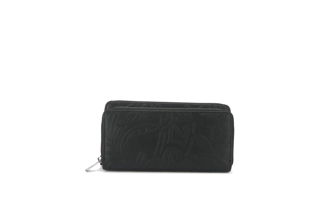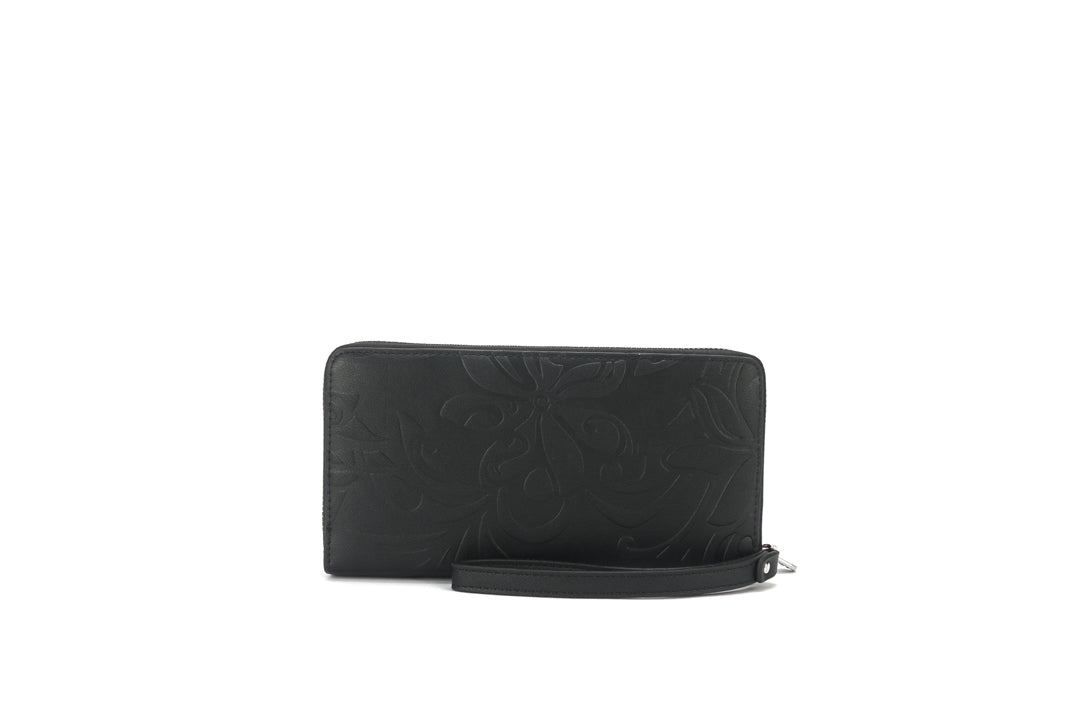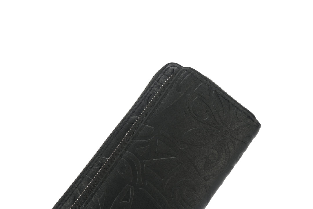 The Allison wallet offers a compact way to carry your essentials! This wallet will protect your credit and debit cards with RFID protection. The wallet has 14 credit card slots, 1 zipped coin compartment, and 3 separated inside pockets large enough to fit all types of currency. We also have a zippered front pocket to hold your phone or similar items and it features a stylish wristlet strap as well! The exclusive Tiare Infinity Embossed pattern in a sleek black makes for the perfect addition to your purse or outfit!