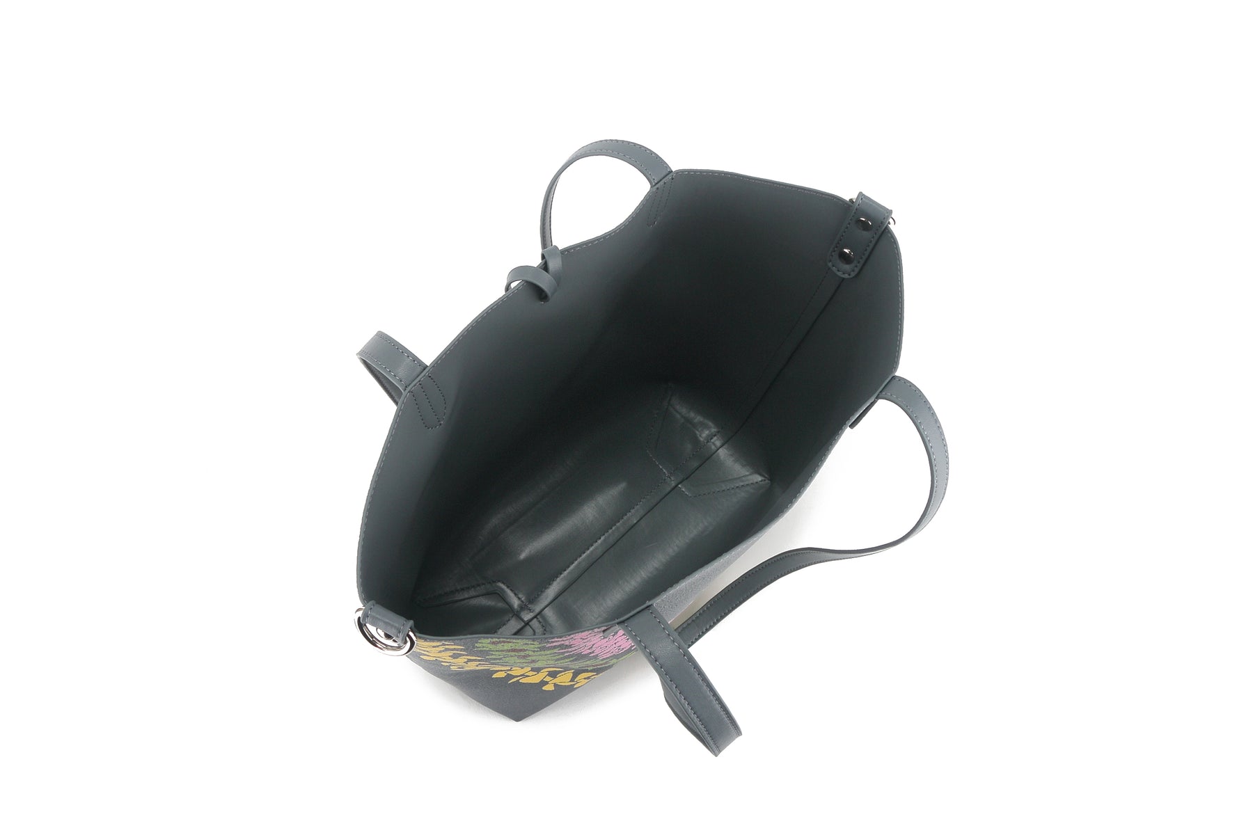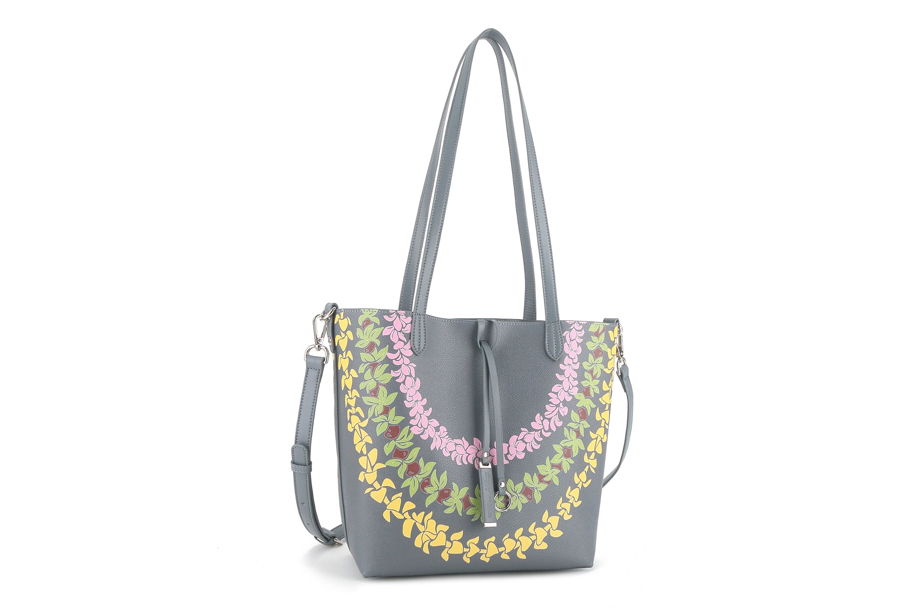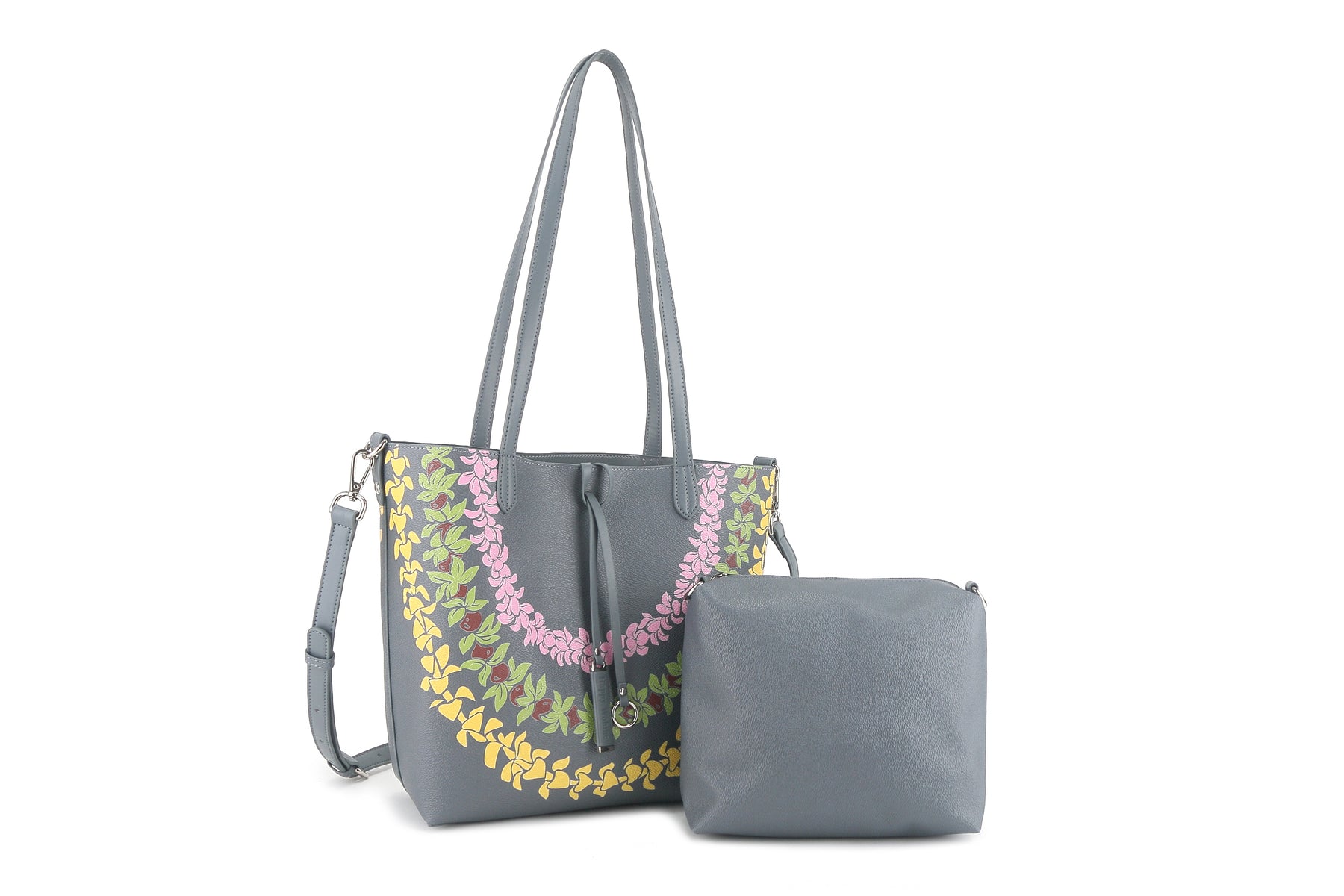 The perfect everyday bag is the Nancy! This tote bag is reversible with a solid color on the inside and our stunning Lei Grey design on the outside. Included in this handbag is another bag! This inside pouch comes with a longer strap and can be used separately as a cross-body purse, or leave it in the bigger bag to help organize and protect all your belongings with the full zip feature. This is the perfect lightweight, flexible, great everyday reversible tote. The high-quality vegan leather material allows easy maintenance for this clutch and provides a great leather like look-and-feel without the weight.