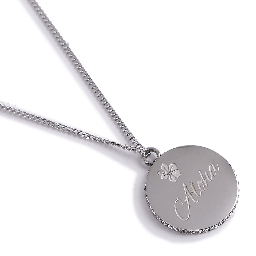 This beautiful long necklace is a great addition to your short necklace or other jewerly. The about 1 inch round disc is engraved with "Happy Wahine" (=Happy Woman) on one side and with a hibiscus flower on the other side. The rim of the disc is decorated with crystals to enhance the style and fashion.