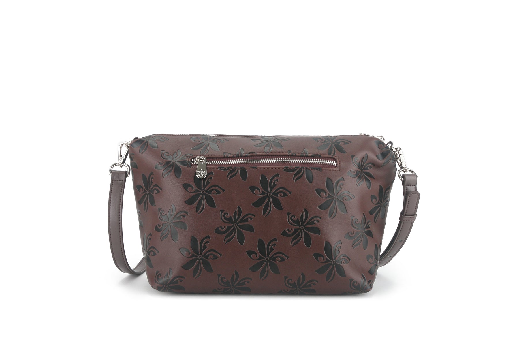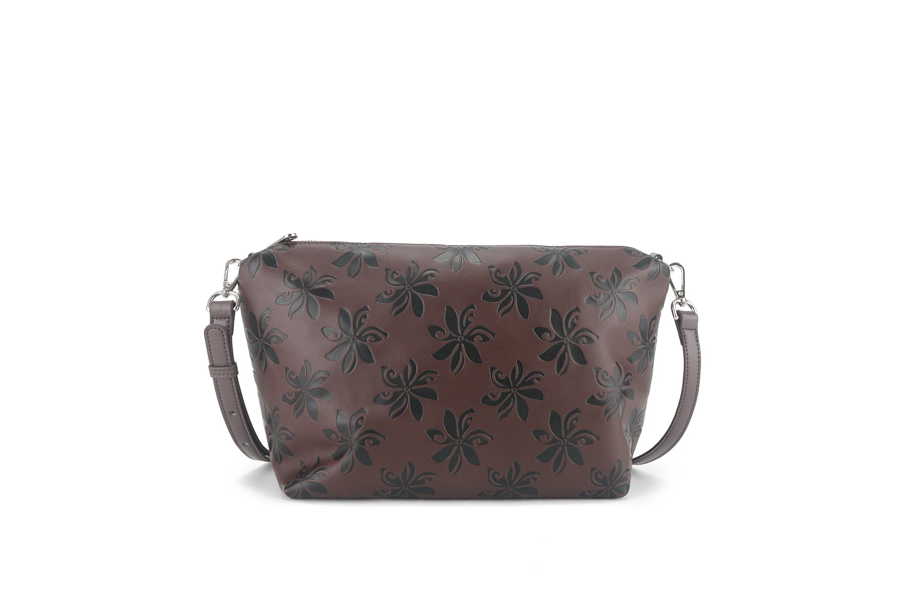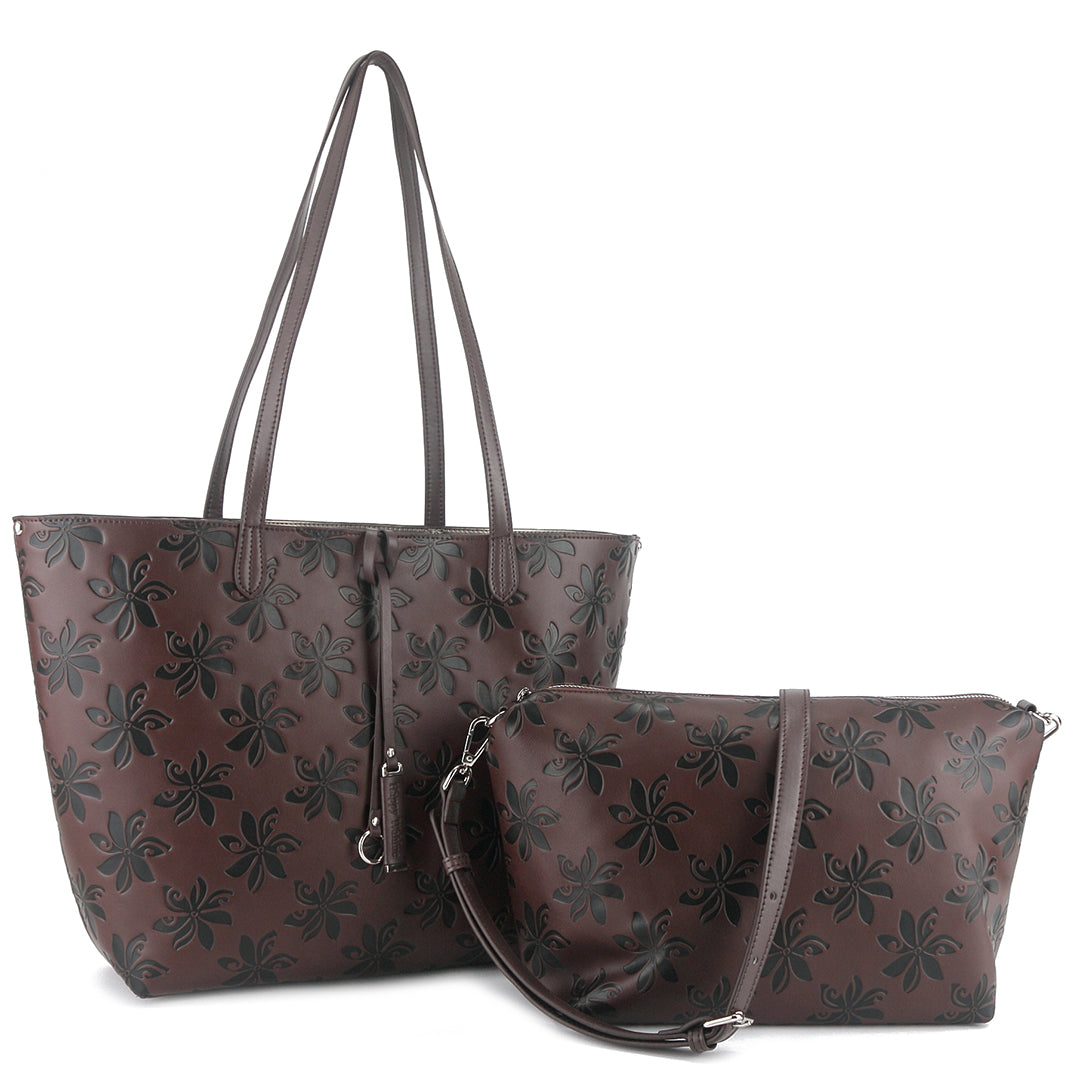 The perfect everyday bag is the Nancy! This tote bag is reversible with a solid color on the inside and our adorable Tiare Brown Embossed print on the outside. Included in this handbag is another bag! This inside pouch comes with a longer strap and can be used separately as a cross-body purse, or leave it in the bigger bag to help organize and protect all your belongings with the full zip feature. This is the perfect lightweight, flexible, great everyday reversible tote. The high-quality vegan leather material allows easy maintenance for this clutch and provides a great leather like look-and-feel without the weight.