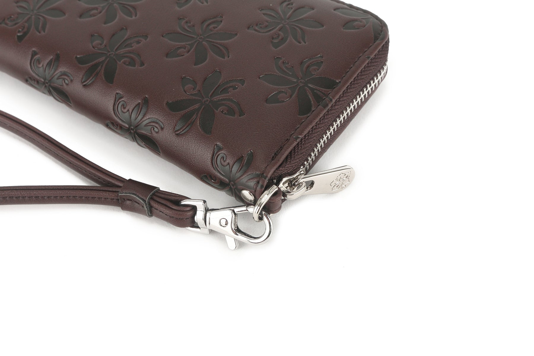 Hold all your essentials in the palm of your hand with the Kaylee Wallet! The wallet has a detachable wristlet strap, 8 credit card slots, 2 side pockets for paper money, 1 zippered coin divider, and 3 separated inside compartments. This wallet is also large enough to hold a passport and phone, and it is RFID protected to keep your cards safe! Our exclusive Tiare Embossed print in brown is the perfect compliment to your purse or outfit!