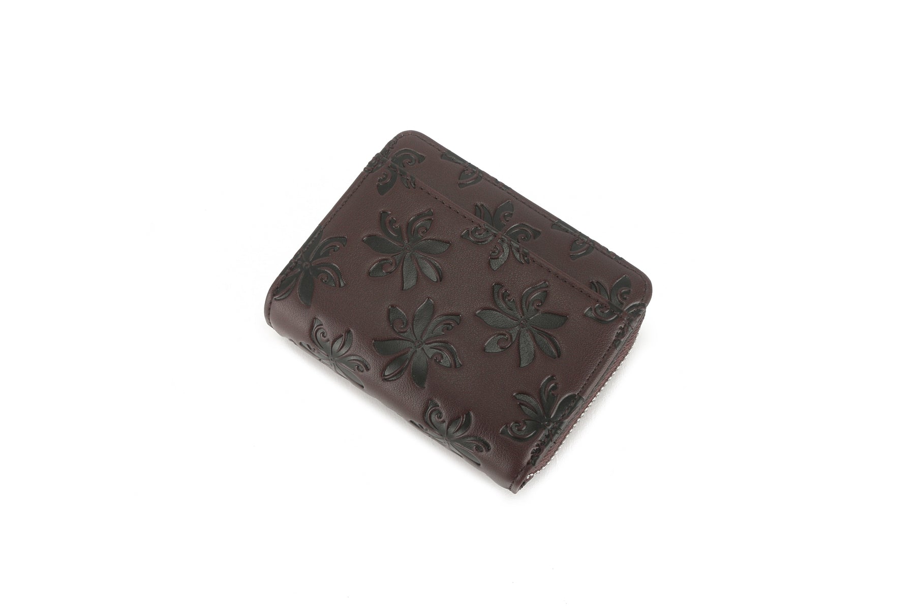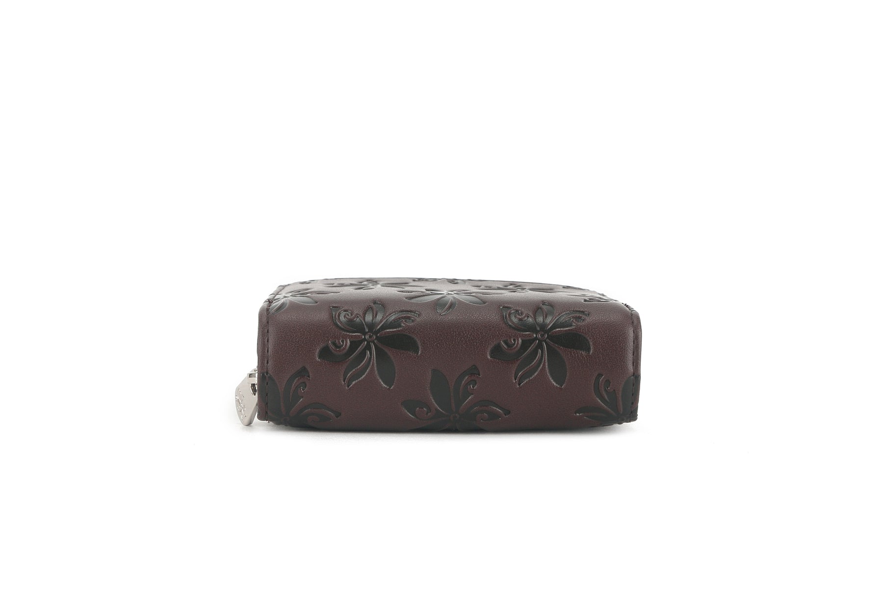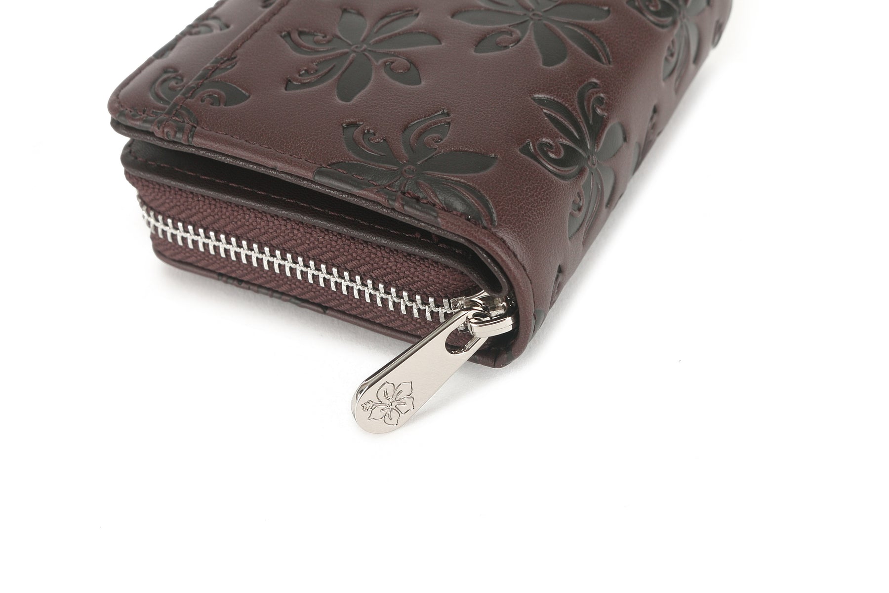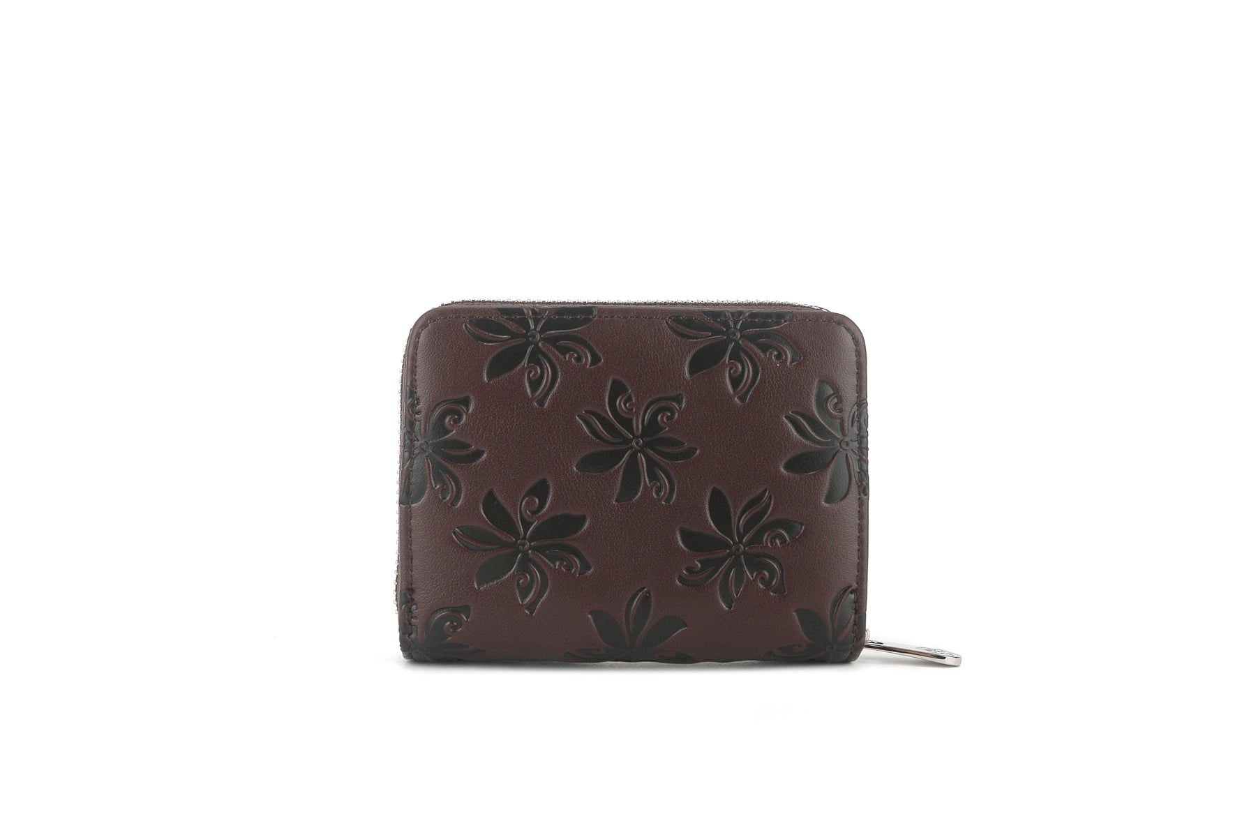 The Tiare Embossed Brown Meily wallet is the perfect small companion that fits into your small crossbody handbag and has all your IDs, cards, and cash handy for you. It has space for 6 cards and can handle your cash as well. The closed zipper compartment also offers plenty of space for additional cards, receipts, or other items. Your ID can fit perfectly into the flap which features a window for your ID.