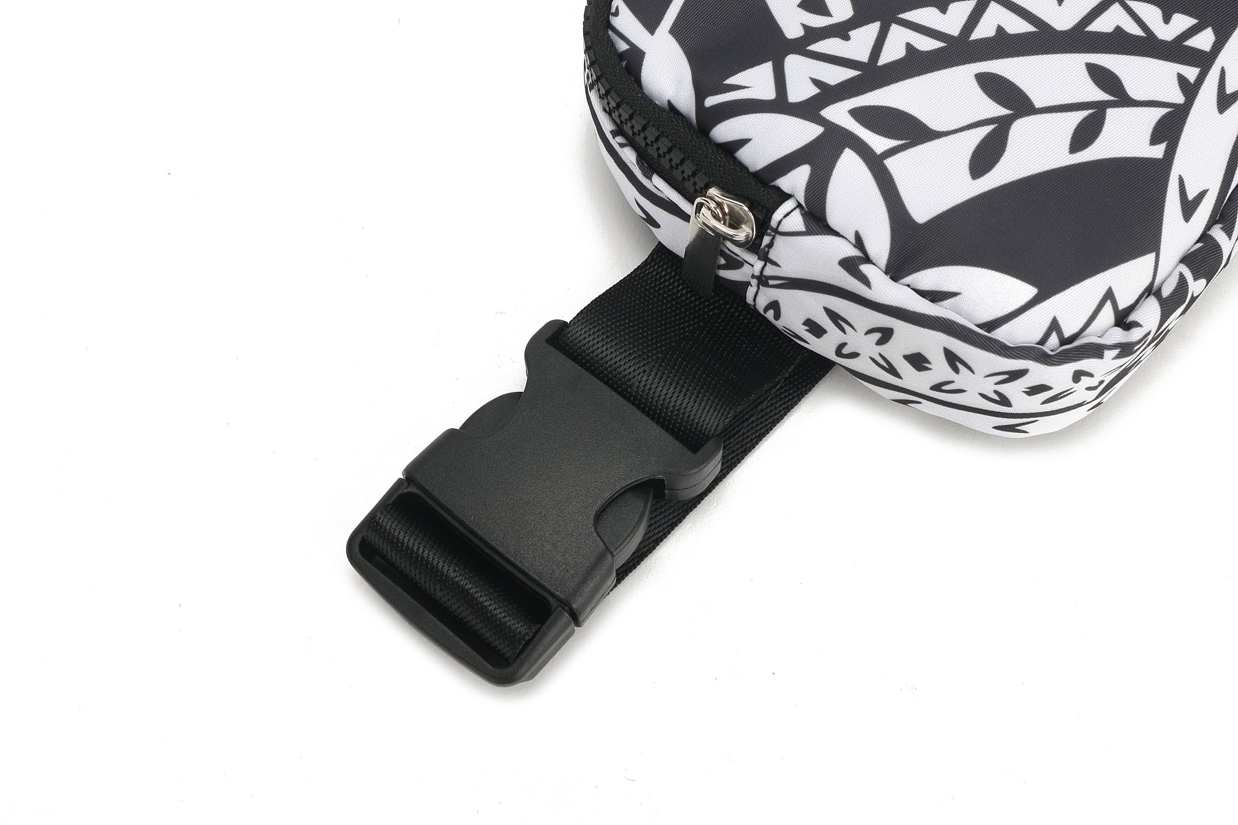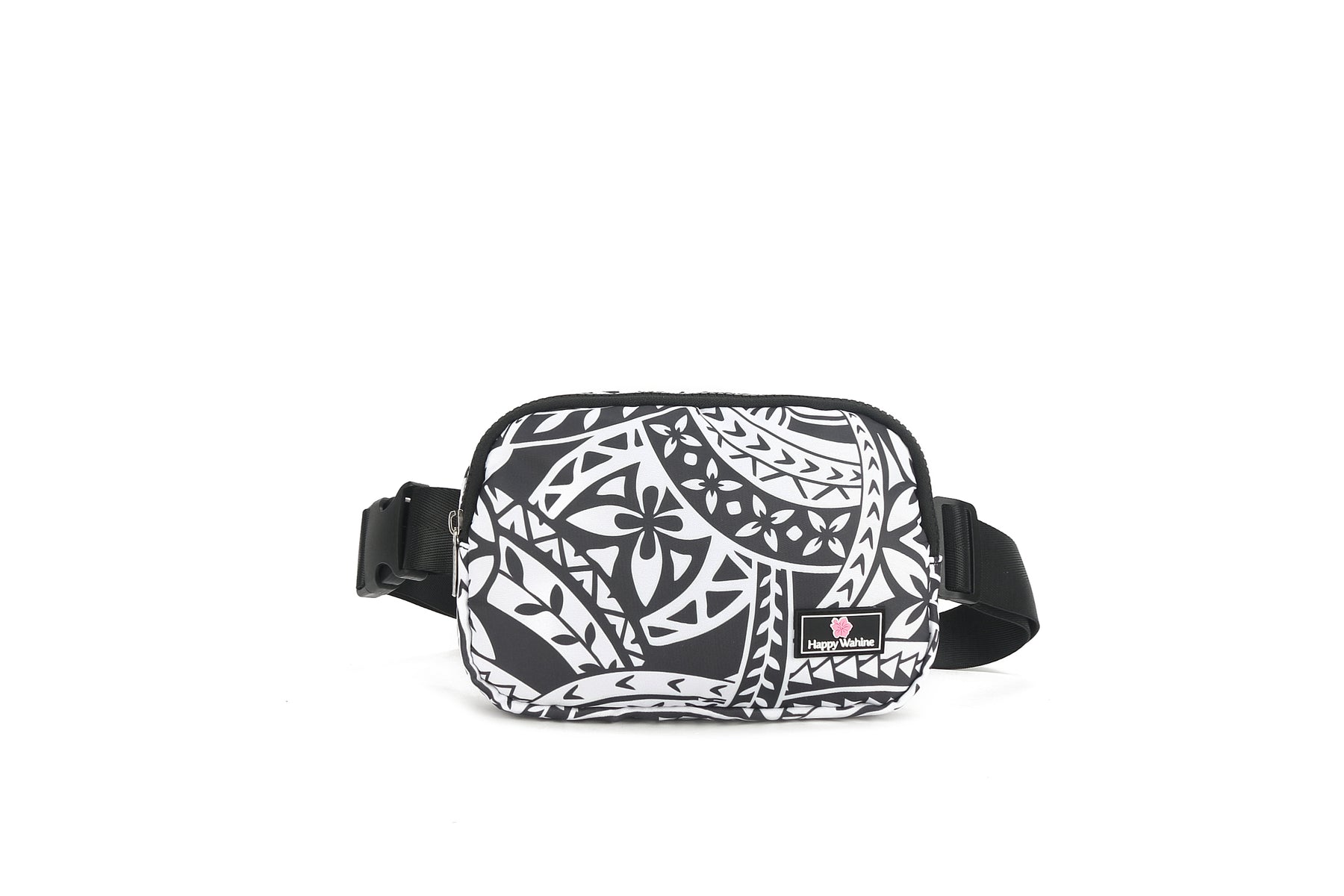 Our exclusive belt bag Jenna was made for those everyday trips to the store, beach, etc. Printed in our exclusive tapa black design this adjustable belt bag has one open and zippered pocket inside and one zippered pocket outside for extra security.