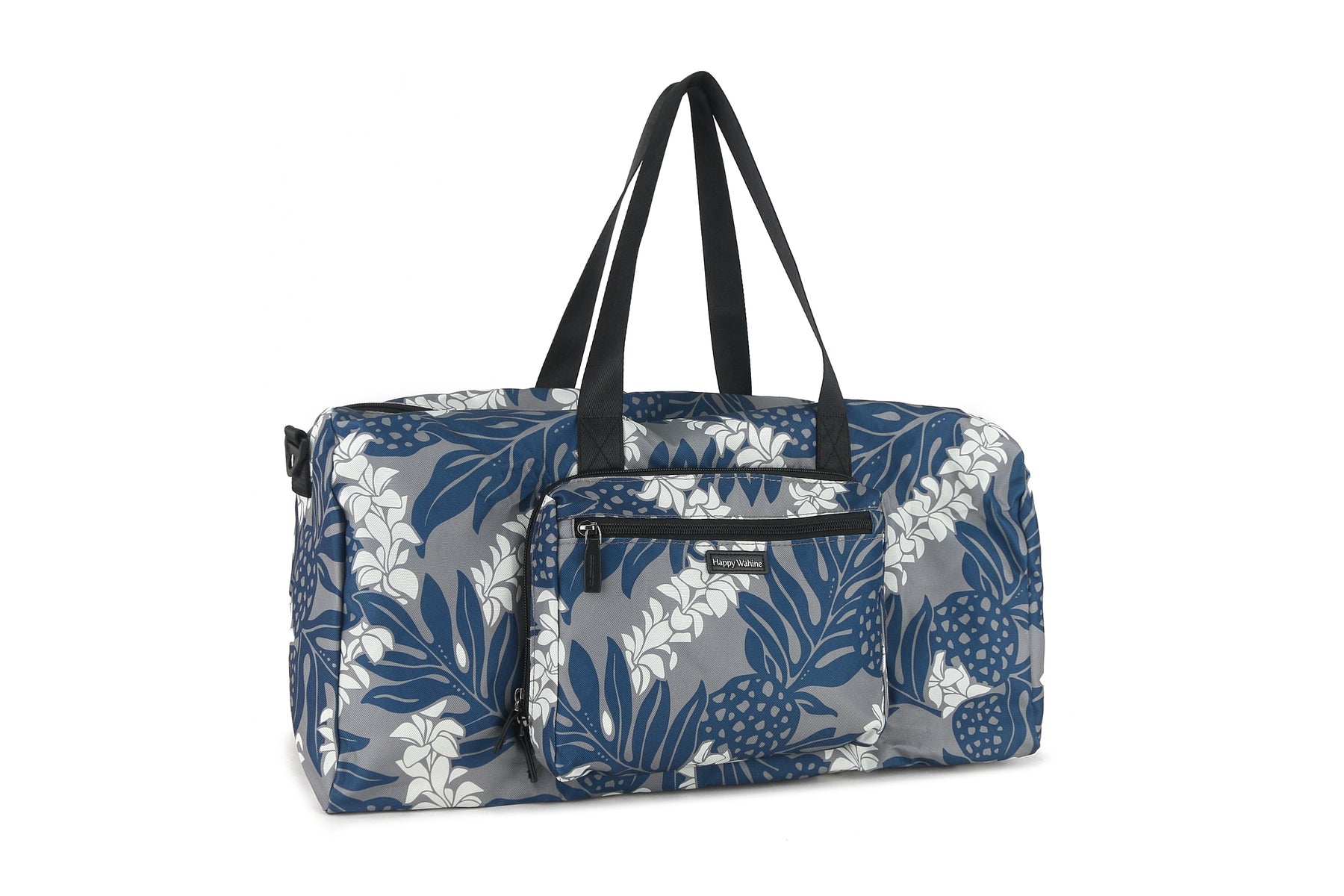 Get ready to travel with our exclusive Stephanie Ulu Lei Grey duffle bag. This duffle features a zippered top with an outside zippered pocket, nylon straps and a roomy interior. It can also be slipped over a luggage handle for easy travel and the duffel folds into itself for easy storage.