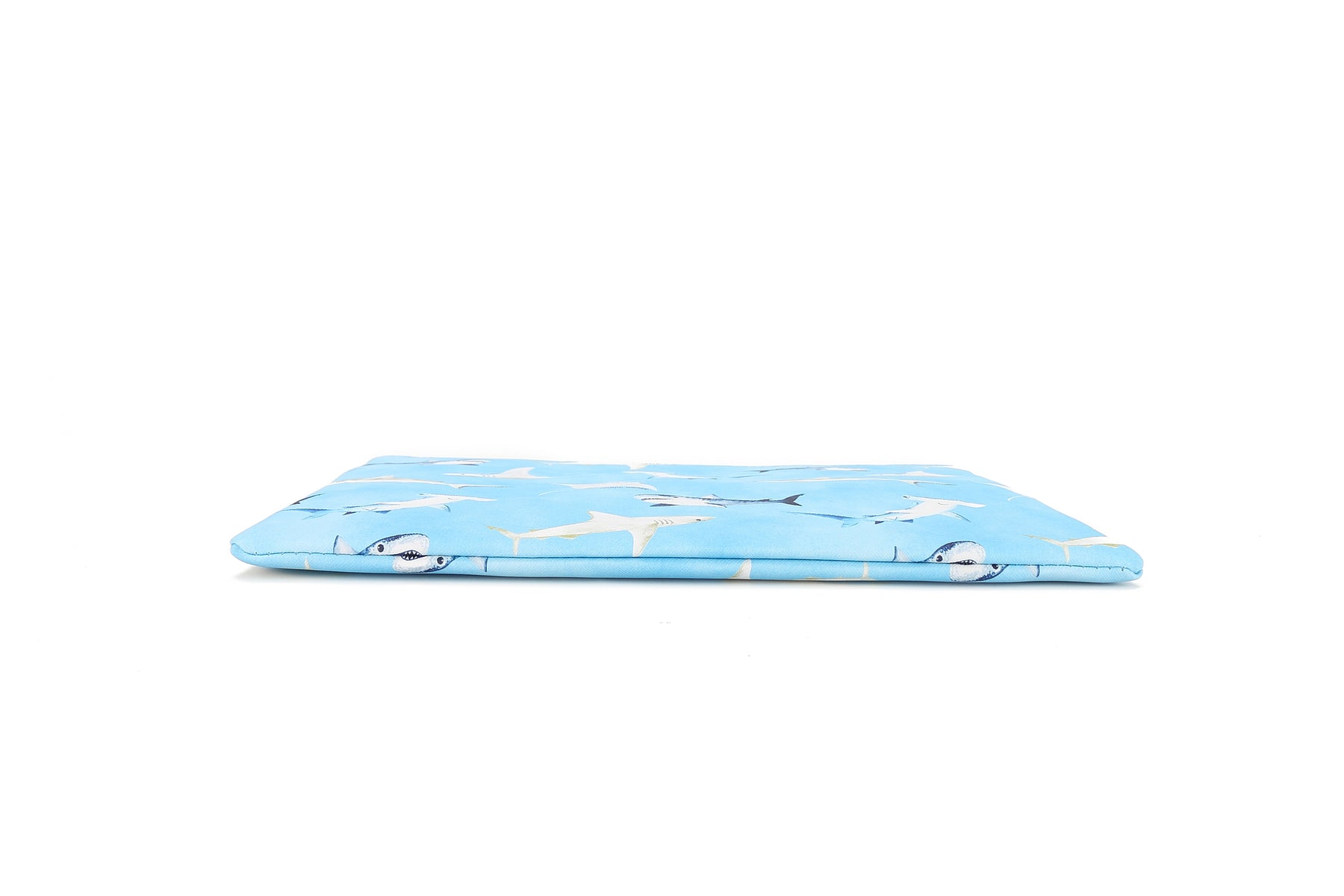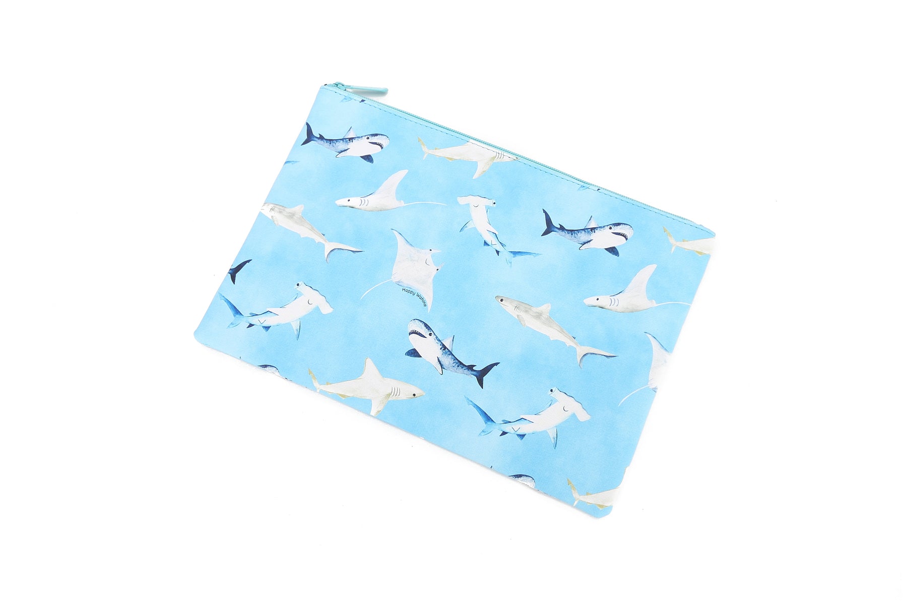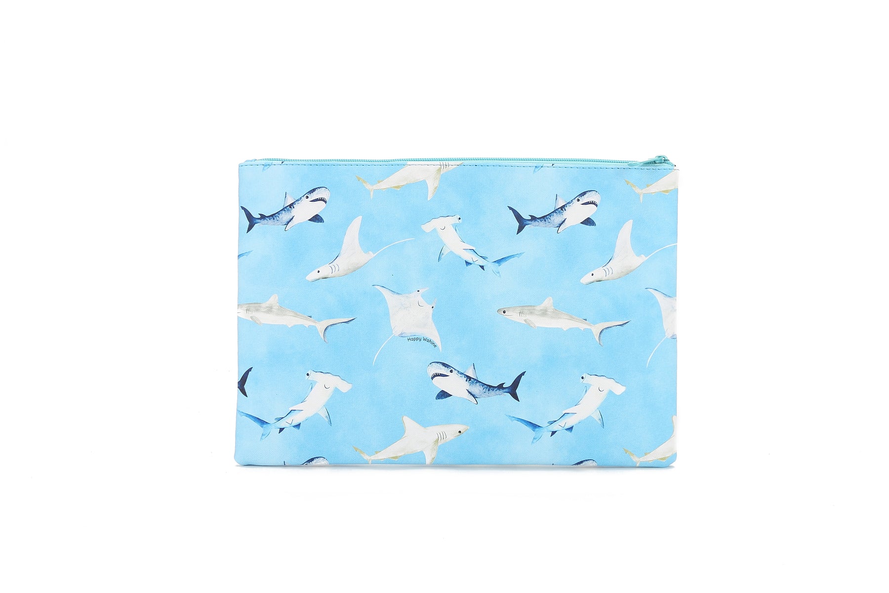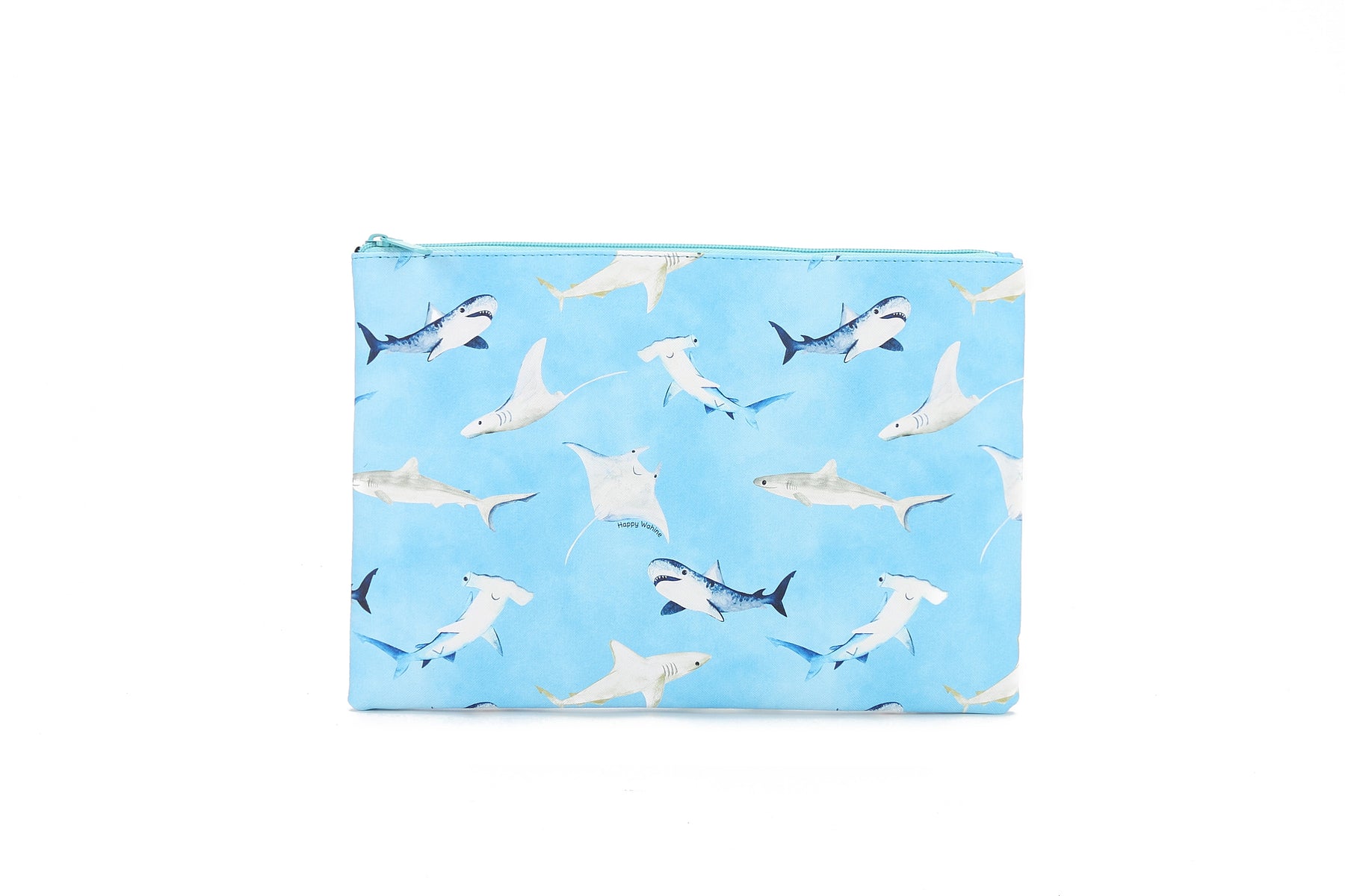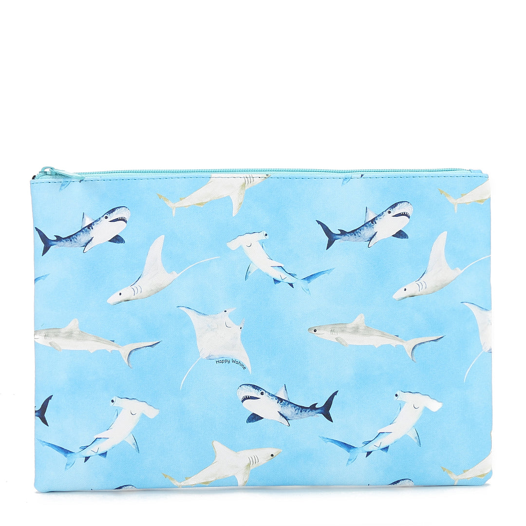 Our largest zip pouch is perfect for a variety of essentials! Store and carry makeup, office supplies, personal items, and more in our largest zip pouch! It also makes a quick and easy foldover clutch for a great night out! Our Happy Sharks Blue print makes for a great addition to your purse or outift!