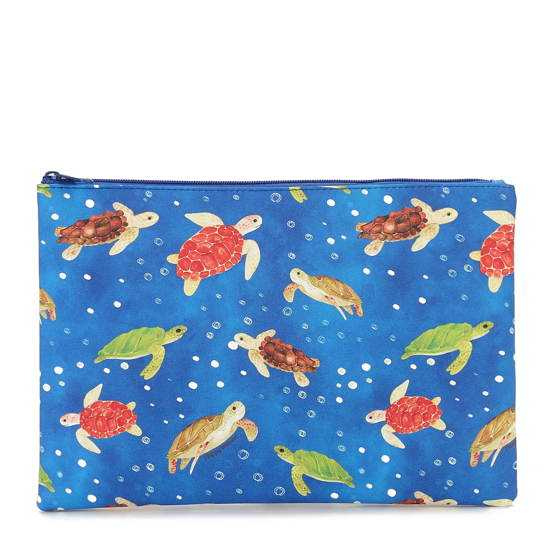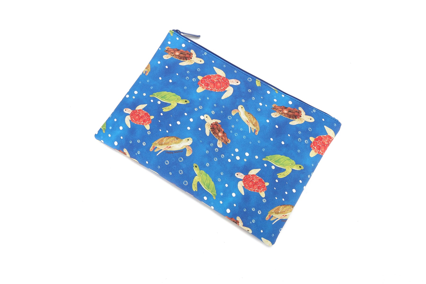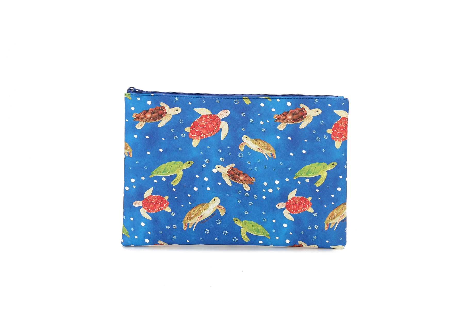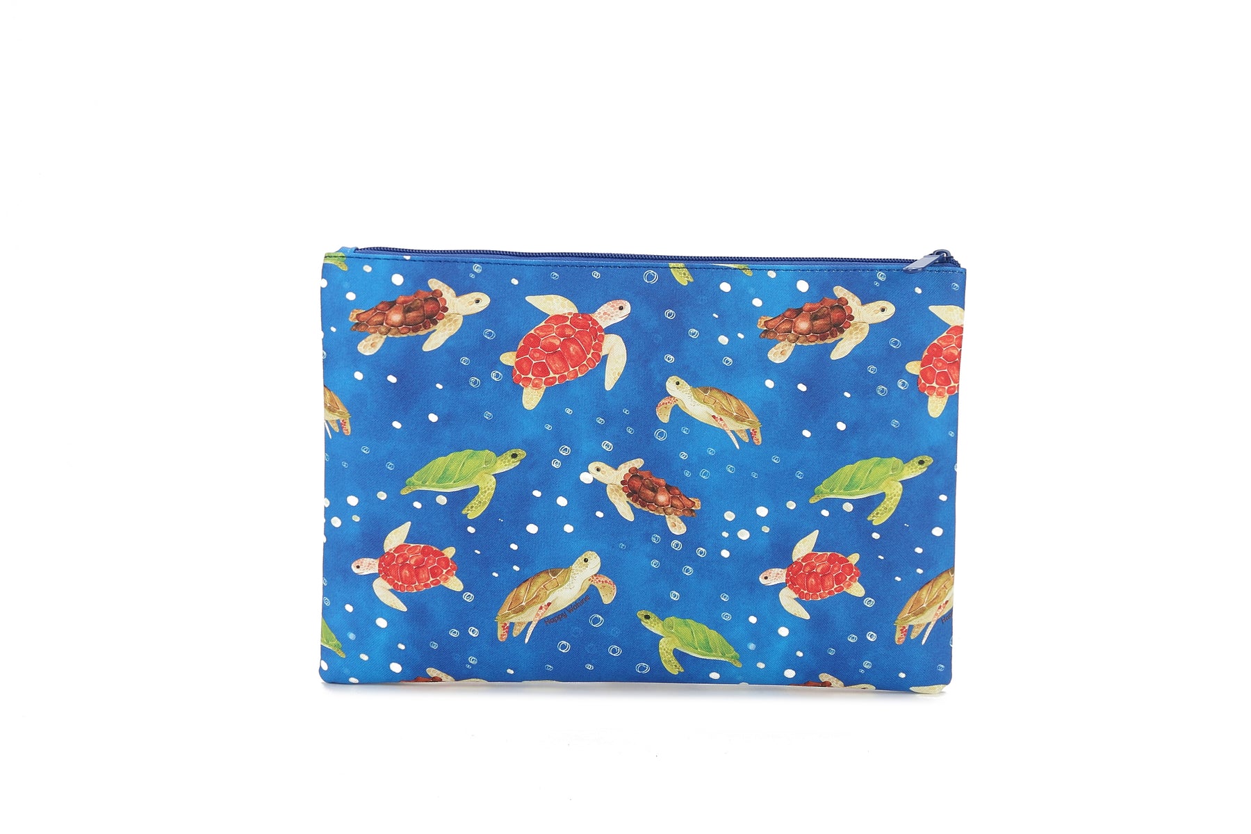 Our largest zip pouch is perfect for a variety of essentials! Store and carry makeup, office supplies, personal items, and more in our largest zip pouch! It also makes a quick and easy foldover clutch for a great night out! Our Local Turtles White print makes for a great addition to your purse or outift!